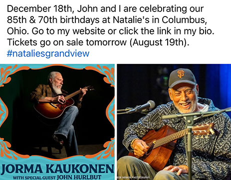 Jorma’s 85th with special guest John Hurlbut’s 70th Birthday Show