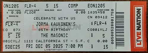 Jorma’s 85th Birthday Celebration Tour plus special guests Susan Tedeschi, Derek Trucks, Sam Grisman, Peter Kaukonen, Bruce Cockburn and John Hurlbut